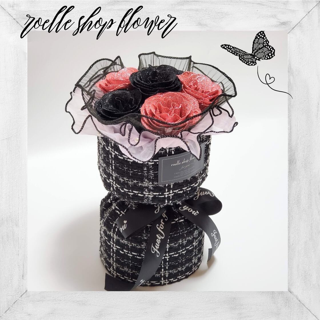 TS-7 ブラック ツイードブーケ グリッターローズ アーティフィシャルフラワー 造花 ワンホンブーケ ブーケ 花束 2色レース付き ブラック&ピンク | roelle(ロエル)|ロエルショップ|ロエルショップフラワー|ロエル公式【roelle shop flower】