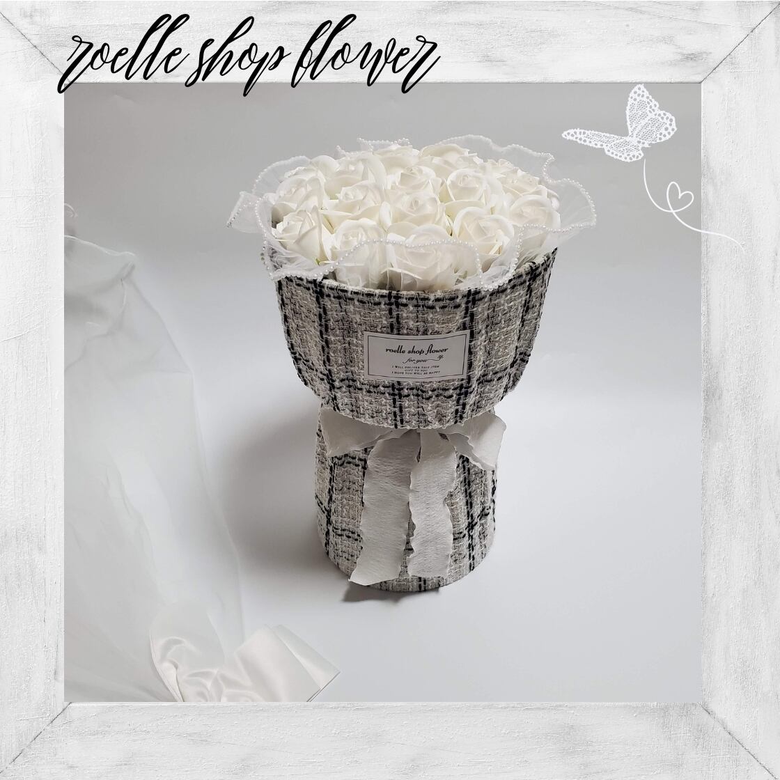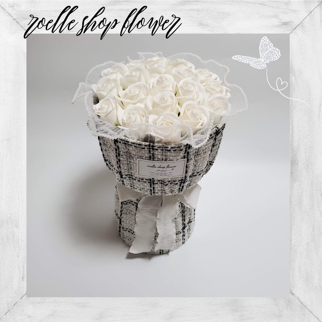 T-9 ホワイト ツイードブーケ ソープフラワー ワンホンブーケ ブーケ ホワイト 白リボン | roelle(ロエル)|ロエルショップ|ロエルショップフラワー|ロエル公式【roelle shop flower】